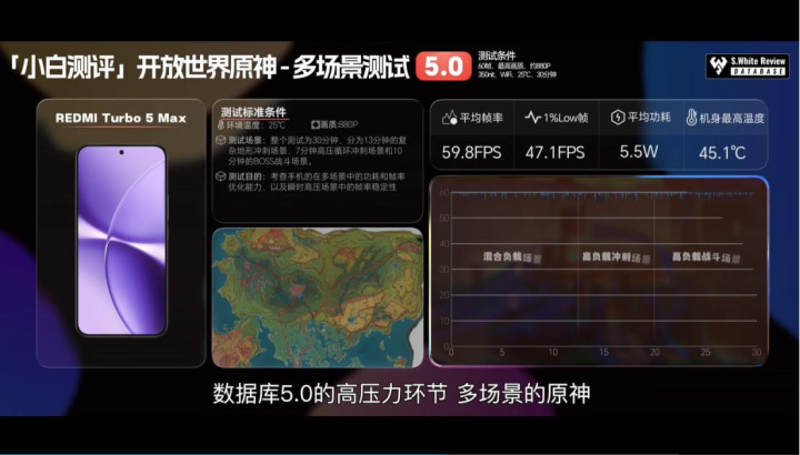 在小白测评的游戏实测中,搭载天玑9500s的Turbo 5 Max,用最高画质跑我们的老演员原神30分钟,平均帧率接近60fps 满帧,1%Low帧也有47.1fps,平均功耗仅5.5w,机身温度也不算高;玩王者荣耀这类轻载游戏,Turbo 5 Max轻松120帧满帧跑,功耗还只有3.56w,在低频运行中天玑9500s依旧是无法超越的巅峰。