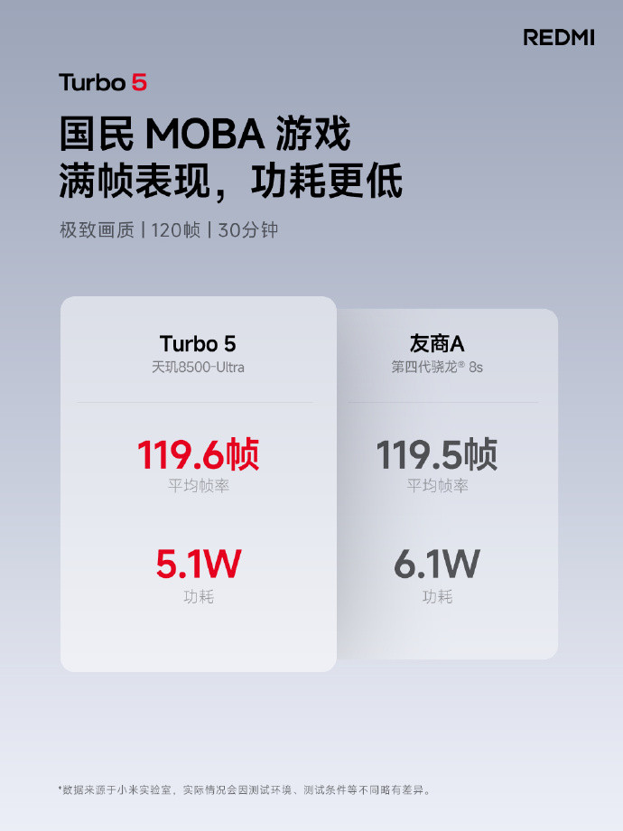 同时,搭载天玑8500的Turbo 5也在发布会上正式亮相,天玑8系的神U体验还在持续更迭,实测在国民MOBA游戏中,REDMI Turbo 5在30分钟120帧满帧跑的同时,功耗比友商更低,这款手机必将给年轻的玩家们带来更多惊喜。